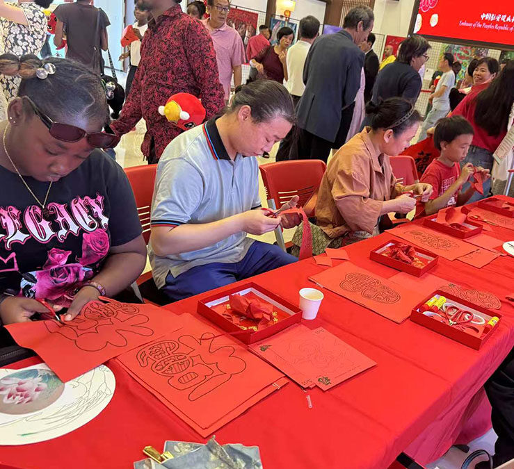 演出精彩绝伦,中国传统歌舞与安巴本地热歌劲曲、特色鼓乐轮番登场。抽奖活动穿插其中,一次次掀起节日的喜庆气氛。表演结束后,中外嘉宾共享盛大的晚宴,参加孔院与使馆员工、华人华侨联合主持的书法、剪纸、绘画和茶艺活动。活动体验性强,参与者不分男女老幼亲自动手,兴致盎然。到场的学生多为孔院试点学校中文班的学生,交流过程中中英文交替出现,语言交流和文化融通同时进行。弘扬中国重要非物质文化遗产的同时,本次春节庆典向华人华侨和安巴民众表达了蛇年的美好祝福,展现了中国文化的独特魅力。