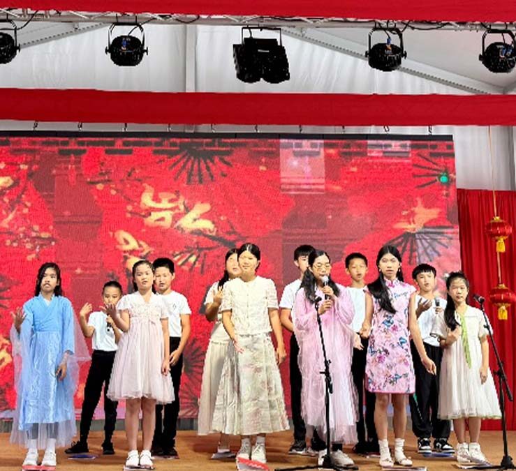 1月26日,安巴孔院中外方院长、教师及志愿者全体出动,赴中国驻安巴大使馆参加蛇年贺新春活动。加勒比国际中文教育理事会理事长阿琳-韦斯特(Arlene Weste)女士也到场同庆。2024年12月初,安巴孔院两位志愿者章译引和张金汶老师开始组织周六华人华侨中文班学生,着手准备配乐诗朗诵《妈妈的祖国》及贺年歌曲《恭喜发财》。演出前一天,也系数到场彩排。庆典当天,为了保证节目质量,孔院成员和参与表演的华人华侨子弟提前一个半小时到场,再次熟悉场地、统一着装和妆效。